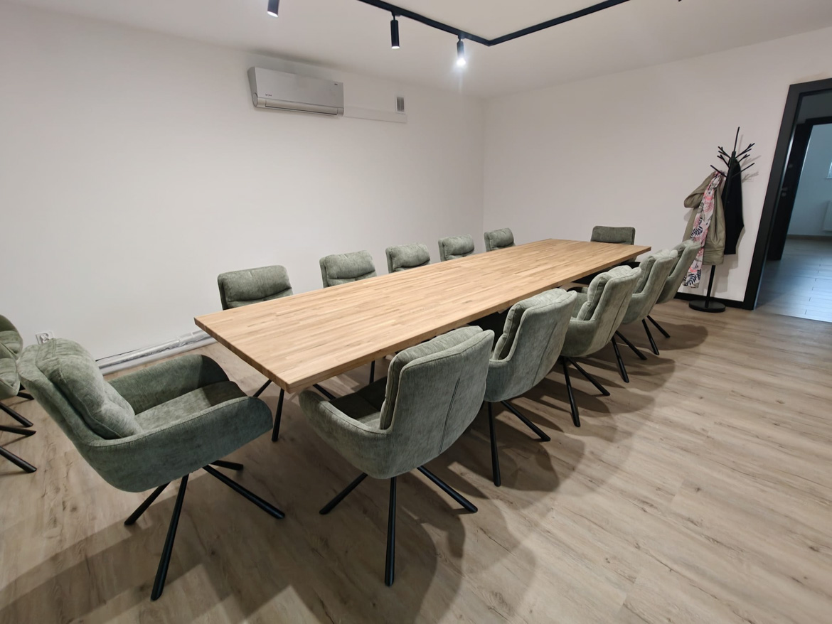 Powstała przestrzeń do spotkań, która jest wygodna i uporządkowana. Stół zapewnia komfort pracy dla większej grupy osób i ułatwia prowadzenie rozmów oraz podejmowanie decyzji.