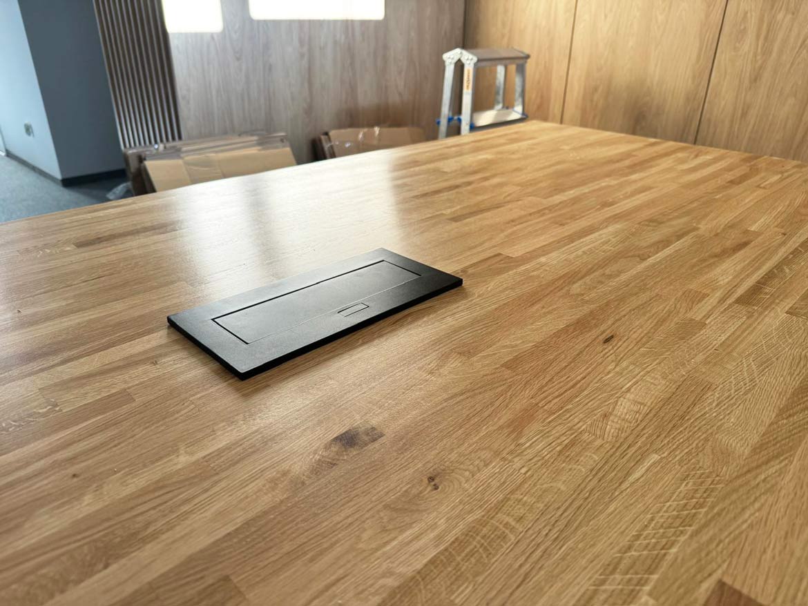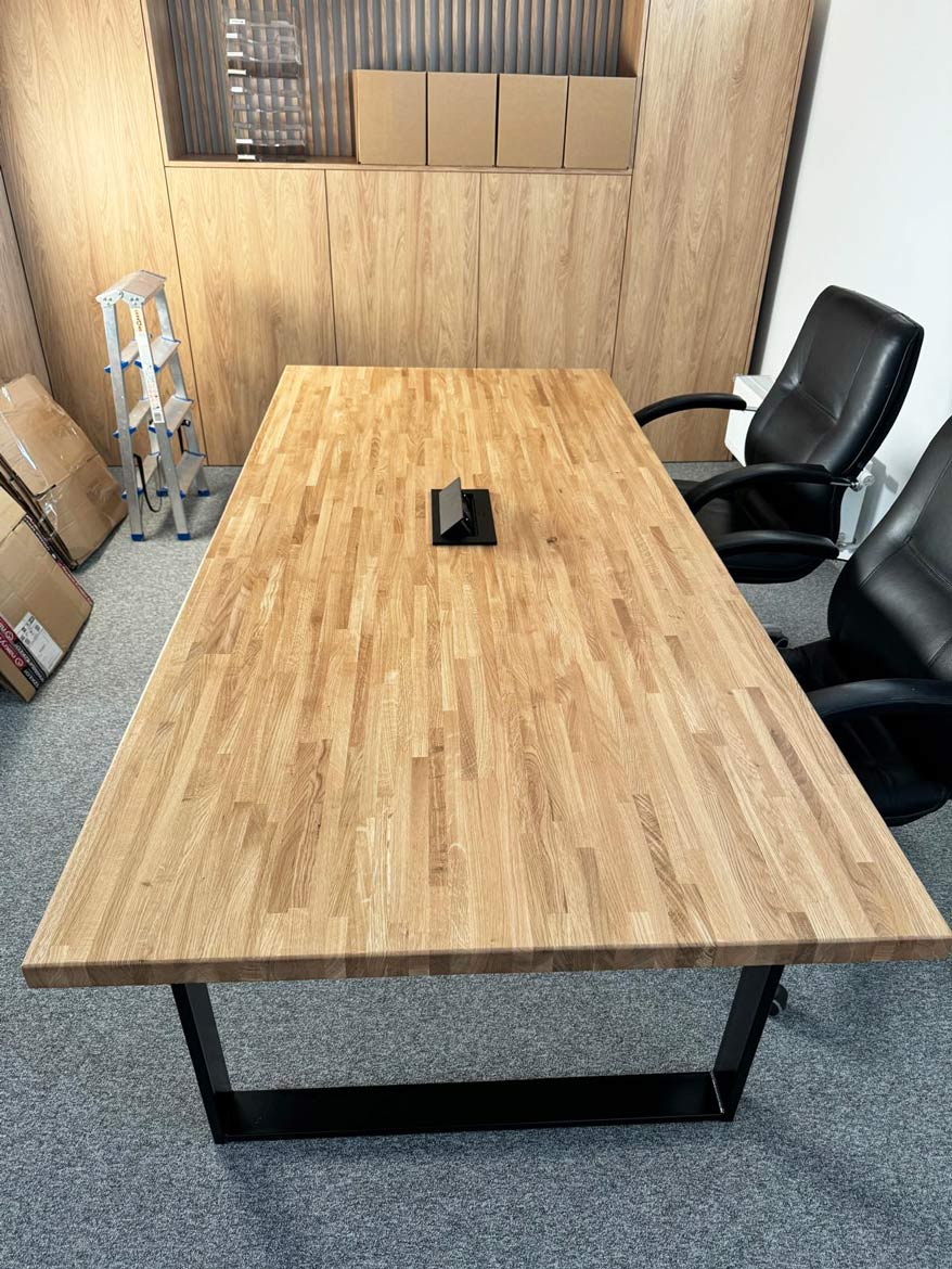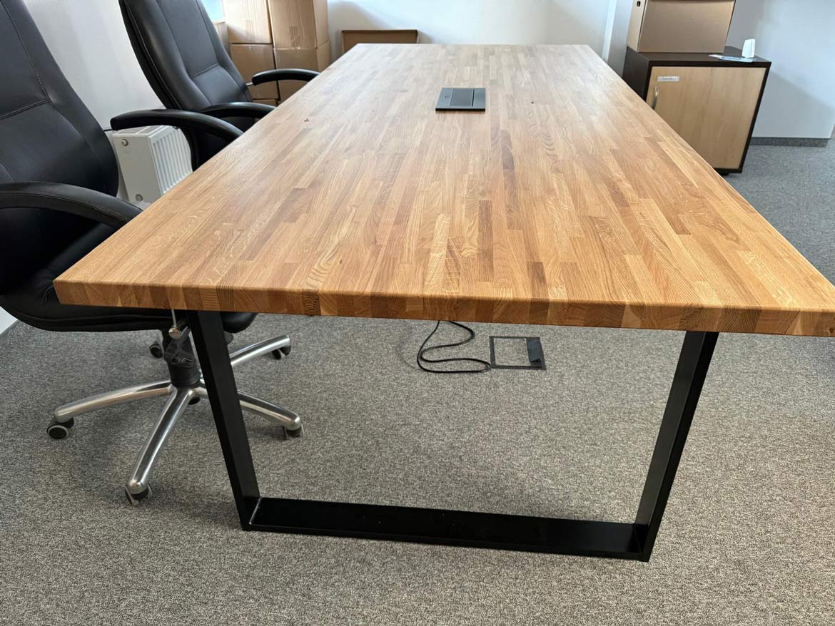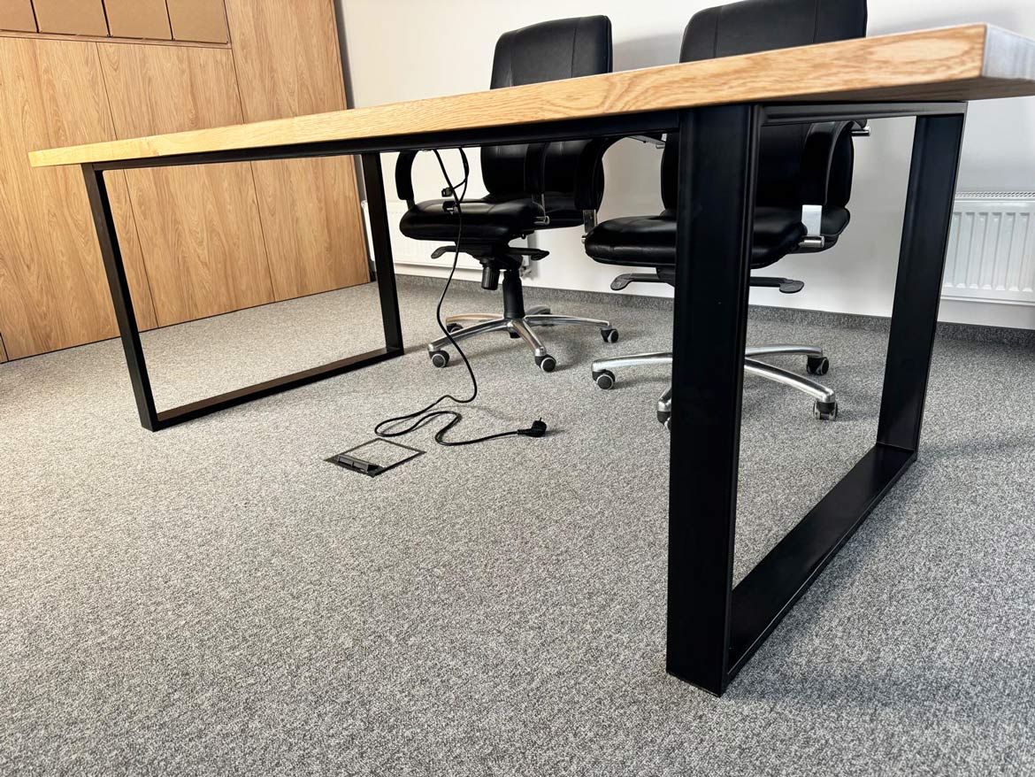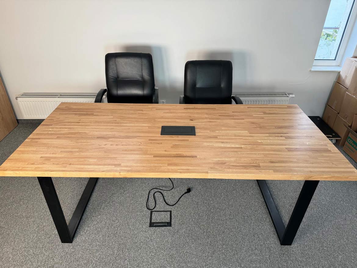 Dla Kancelarii Radców Prawnych we Wrocławiu przygotowaliśmy niewielki stół konferencyjny, który świetnie sprawdza się podczas spotkań i codziennej pracy. Ma solidny blat z dębowego drewna i czarną, metalową podstawę – proste połączenie, które zawsze wygląda dobrze.