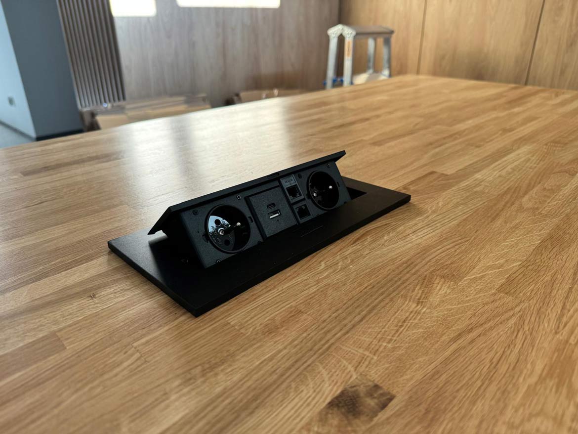 W blacie znalazło się też praktyczne gniazdo zasilania, dzięki któremu można wygodnie podłączyć laptop czy ładowarkę bez plątaniny kabli. To prosty, ale bardzo funkcjonalny mebel, który dobrze pasuje do charakteru kancelarii.
