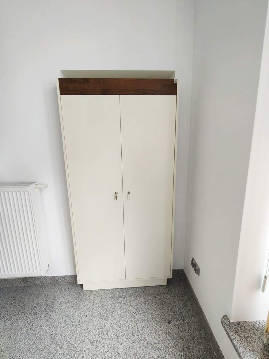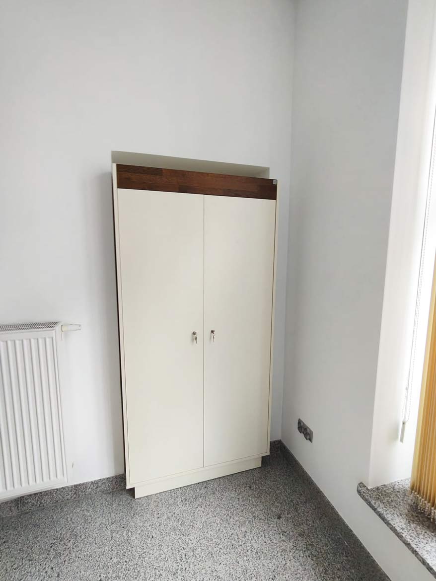 Dla Pana Arkadiusza przygotowaliśmy szafę wykonaną z ciemnego drewna cuban cigaro oraz płyty meblowej w kolorze kości słoniowej. Taki zestaw daje spokojny, elegancki efekt i świetnie sprawdza się w biurze lub domowym gabinecie.