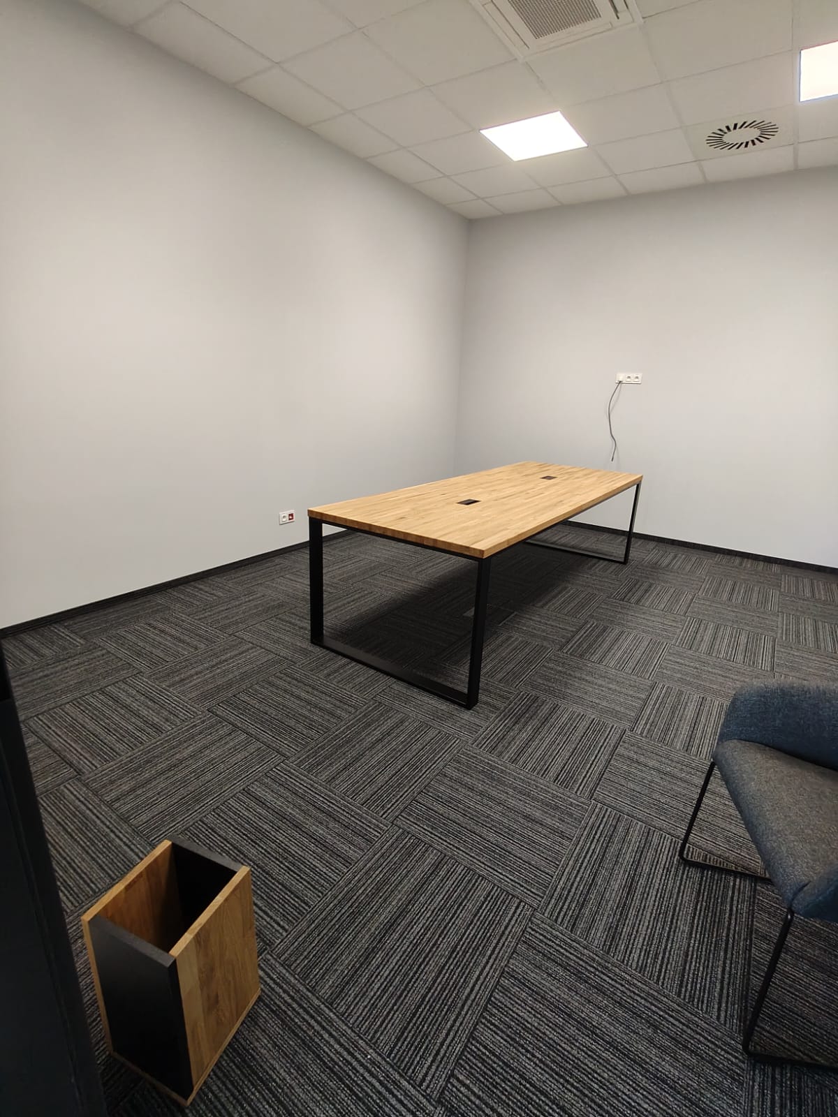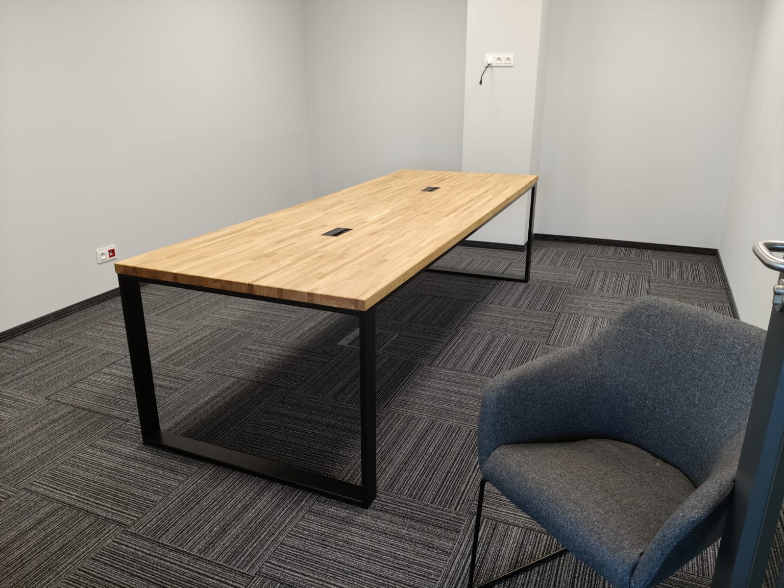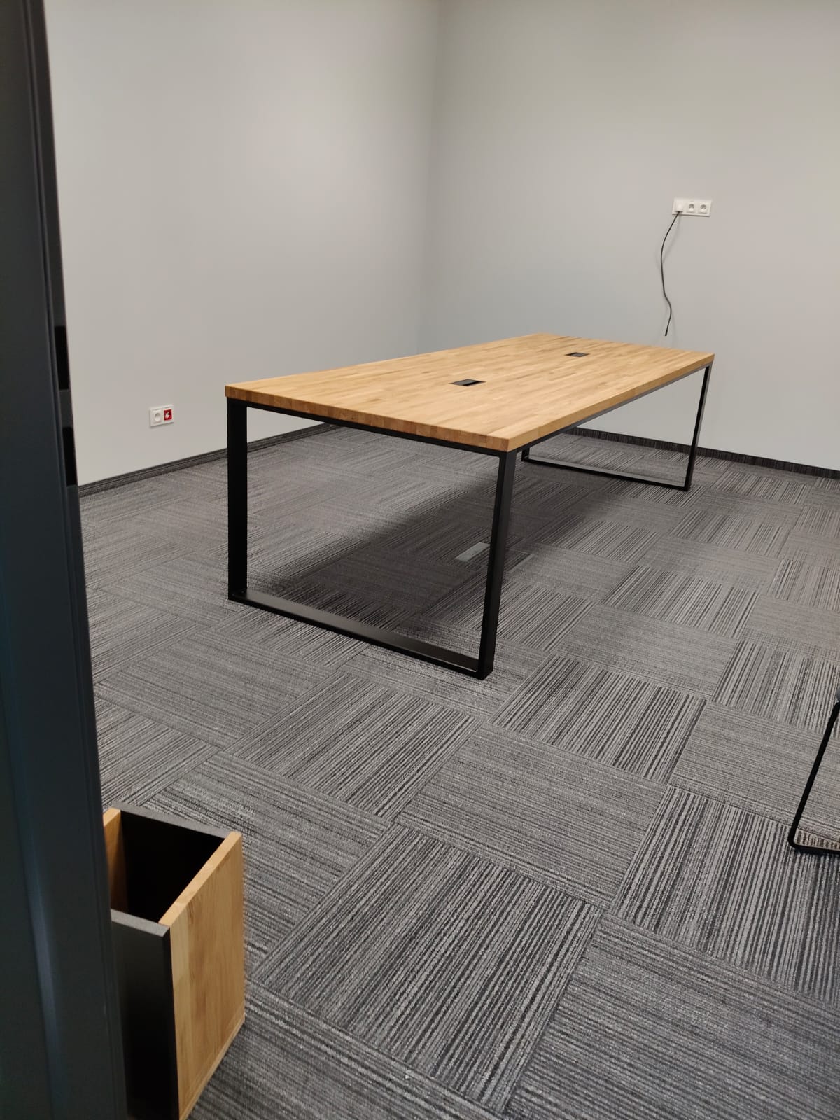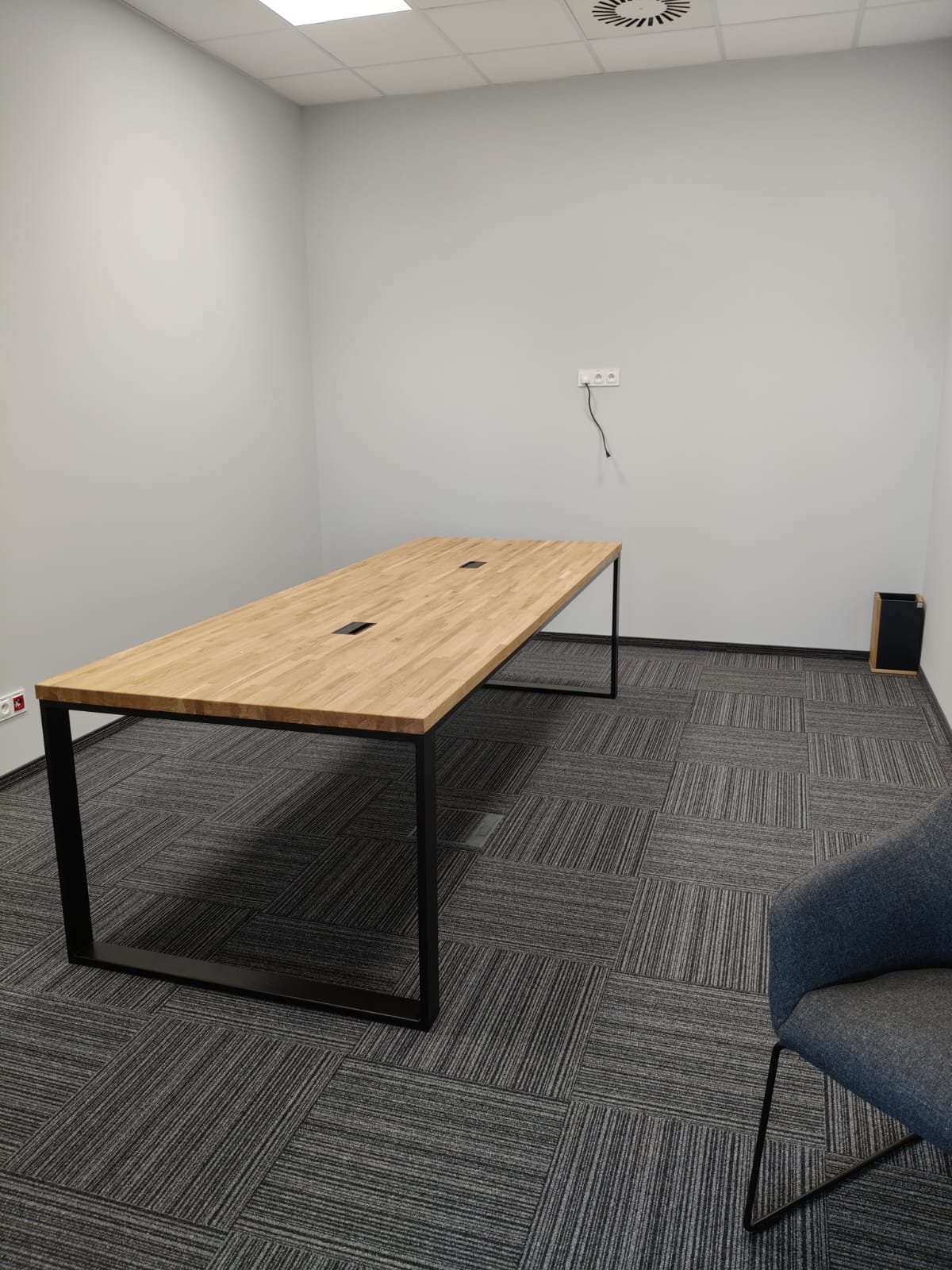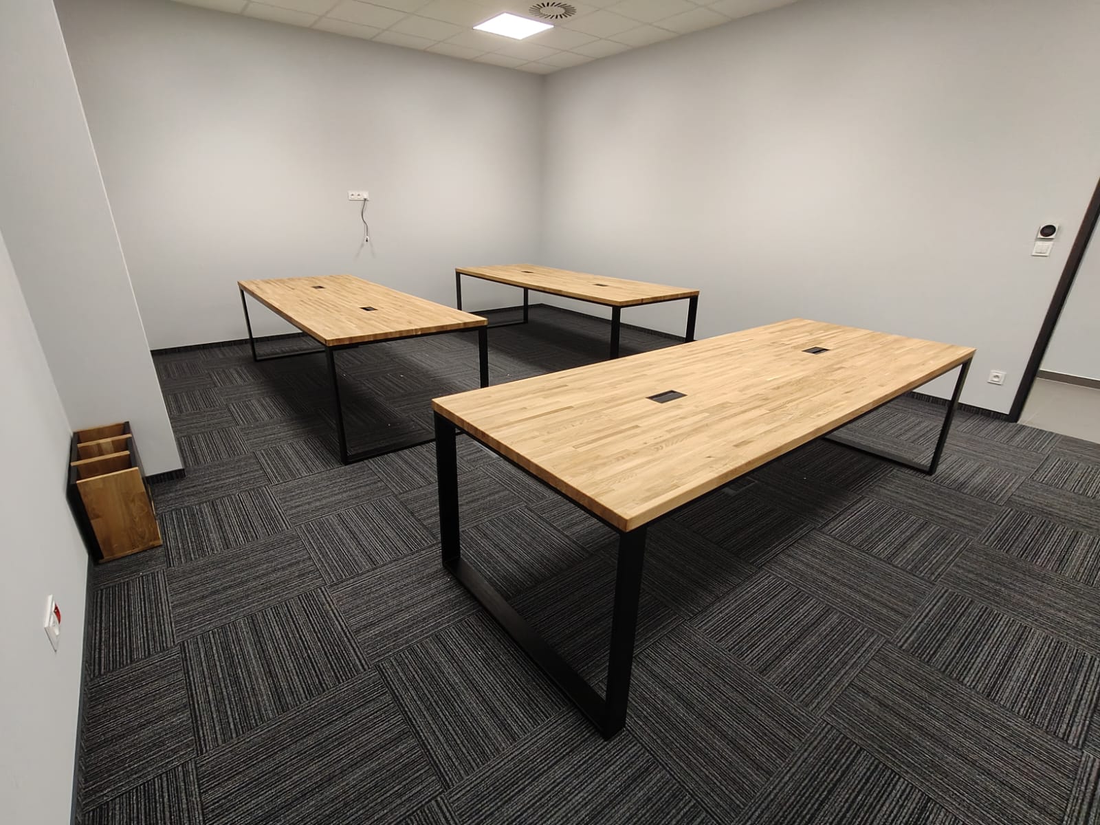 W tej realizacji przygotowaliśmy wyposażenie sali konferencyjnej dla firmy produkcyjnej działającej pod Katowicami. Wstawiliśmy trzy duże stoły z masywnymi dębowymi blatami i metalowymi nogami. To proste, solidne i wygodne rozwiązanie – idealne do codziennych spotkań, prezentacji czy pracy zespołowej. Stoły mają przepusty na kable, więc łatwo zachować porządek podczas korzystania z laptopów czy sprzętu multimedialnego.