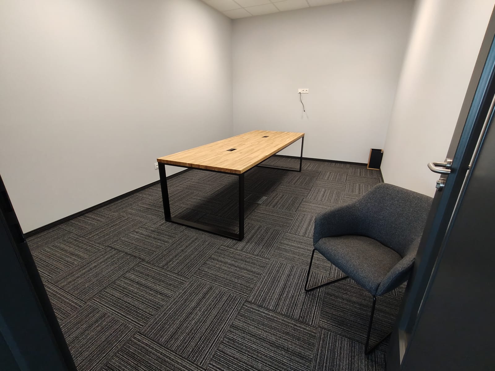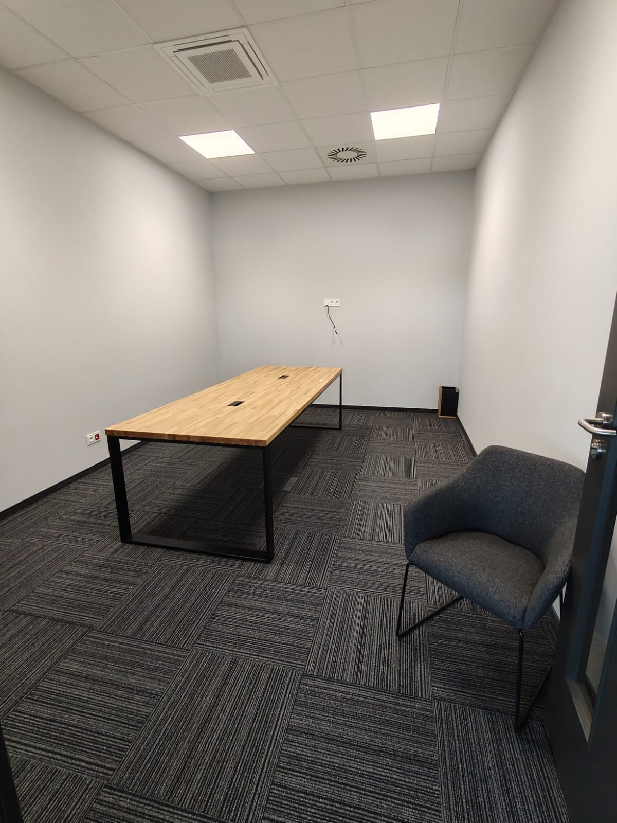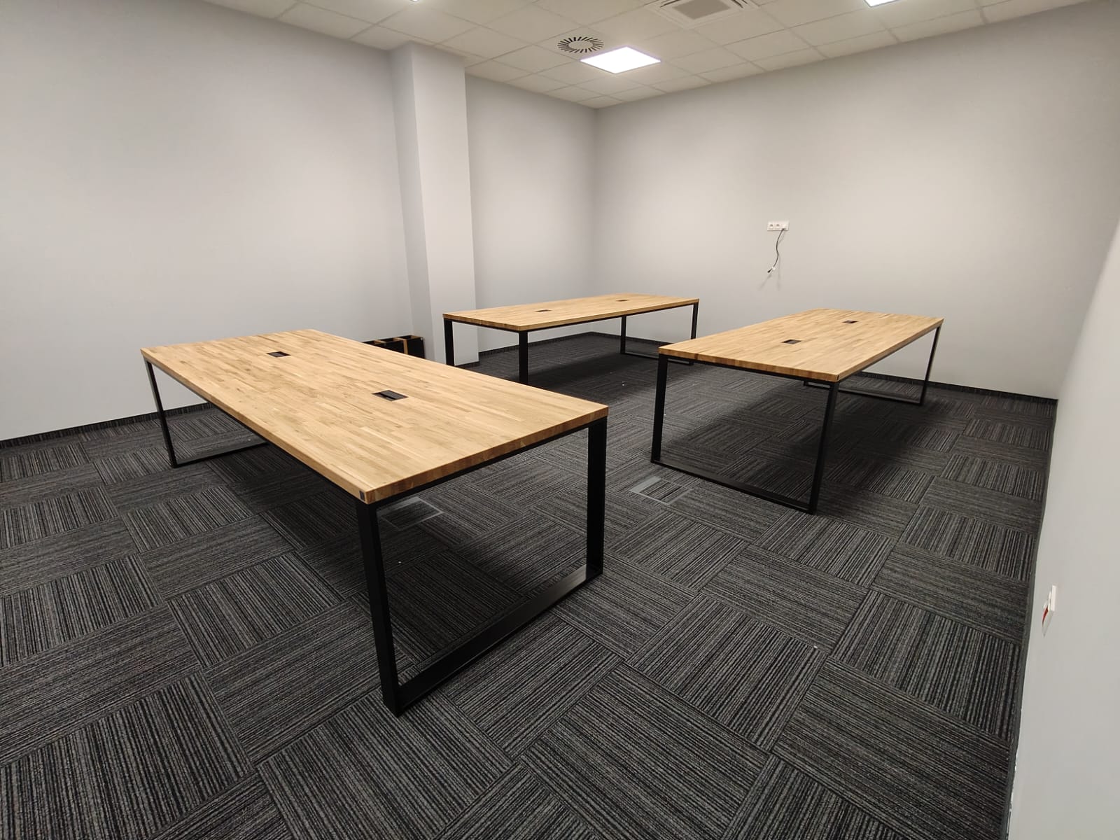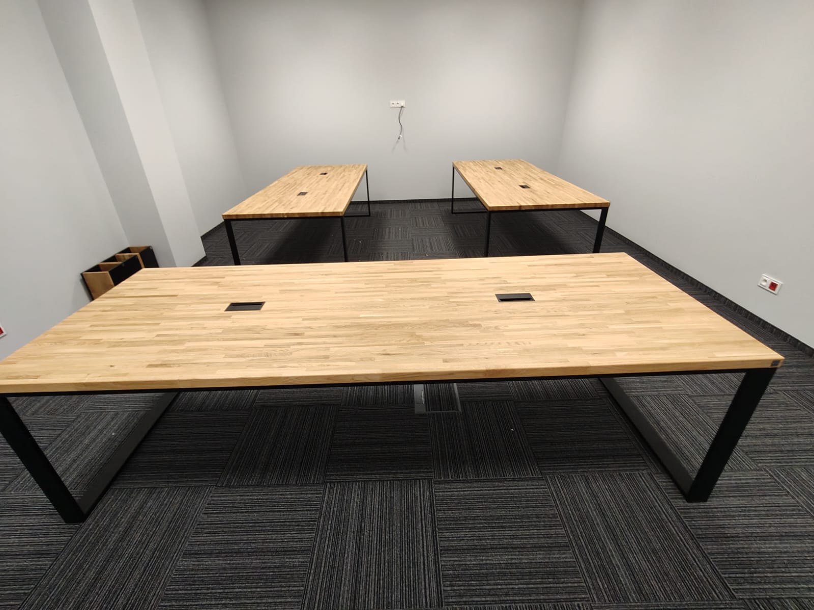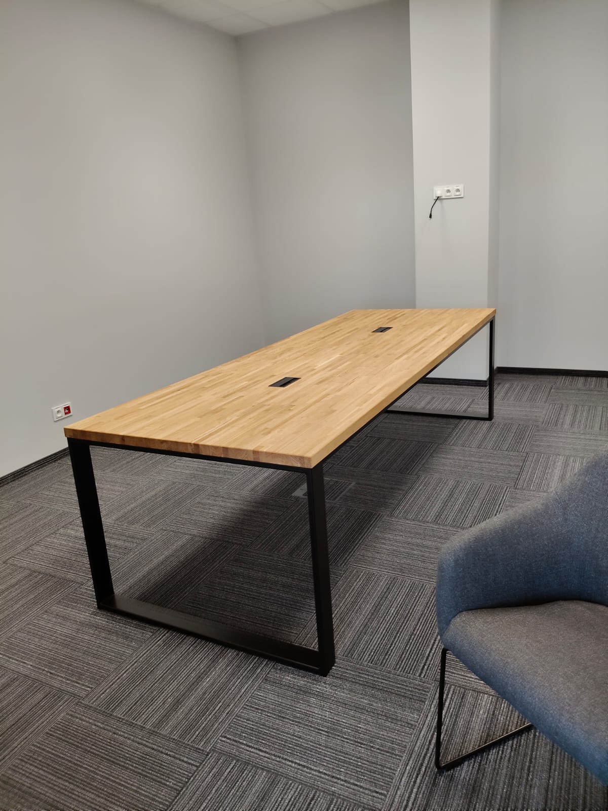 W tej realizacji przygotowaliśmy wyposażenie sali konferencyjnej dla firmy produkcyjnej działającej pod Katowicami. Wstawiliśmy trzy duże stoły z masywnymi dębowymi blatami i metalowymi nogami. To proste, solidne i wygodne rozwiązanie – idealne do codziennych spotkań, prezentacji czy pracy zespołowej. Stoły mają przepusty na kable, więc łatwo zachować porządek podczas korzystania z laptopów czy sprzętu multimedialnego.