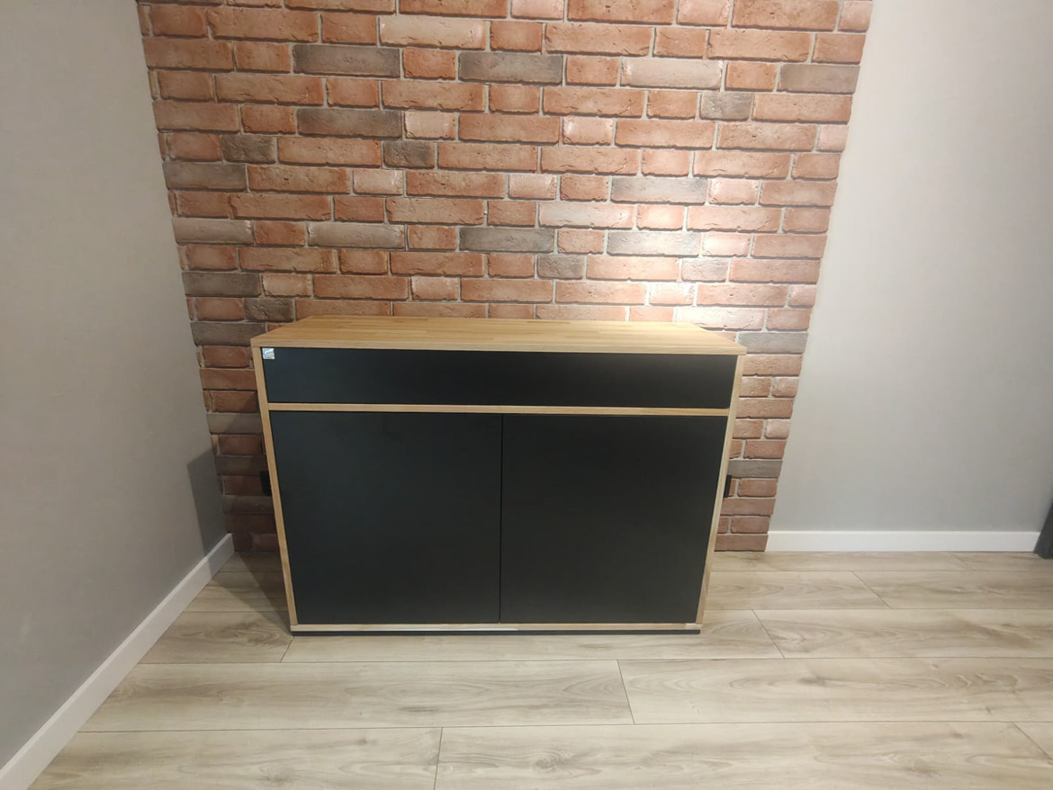 Naturalne drewno i czarne elementy nadają wnętrzu nowoczesny, spokojny klimat. To przestrzeń, w której wygodnie się pracuje i łatwo utrzymać porządek każdego dnia.