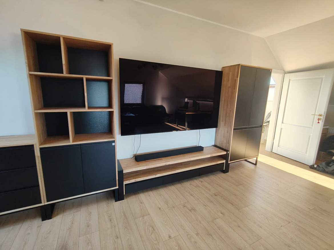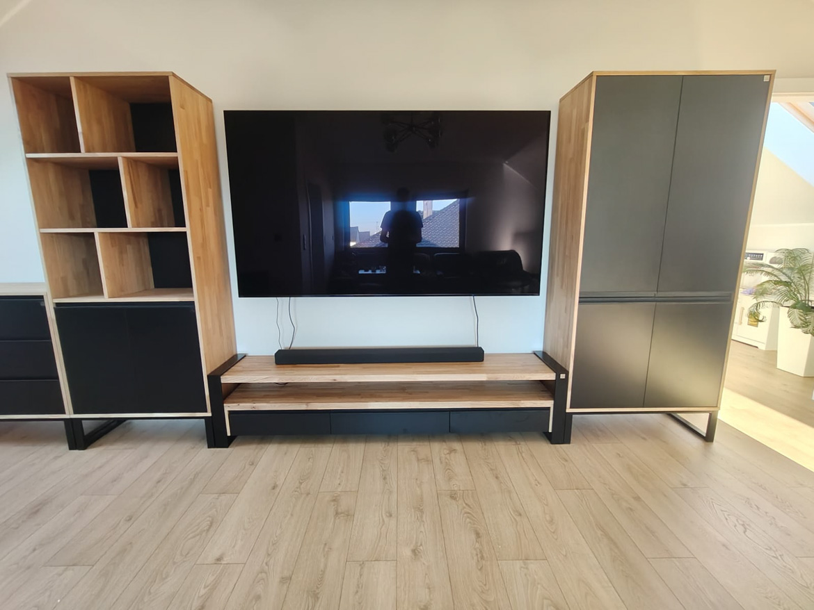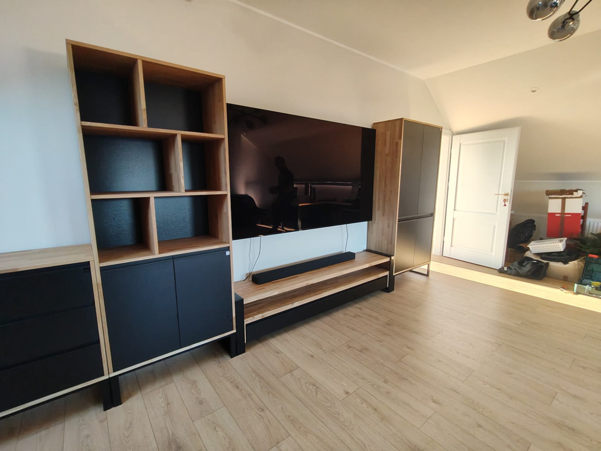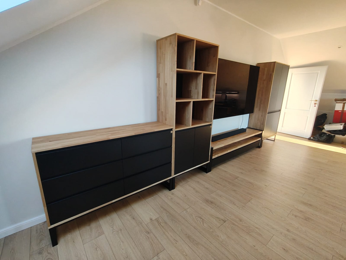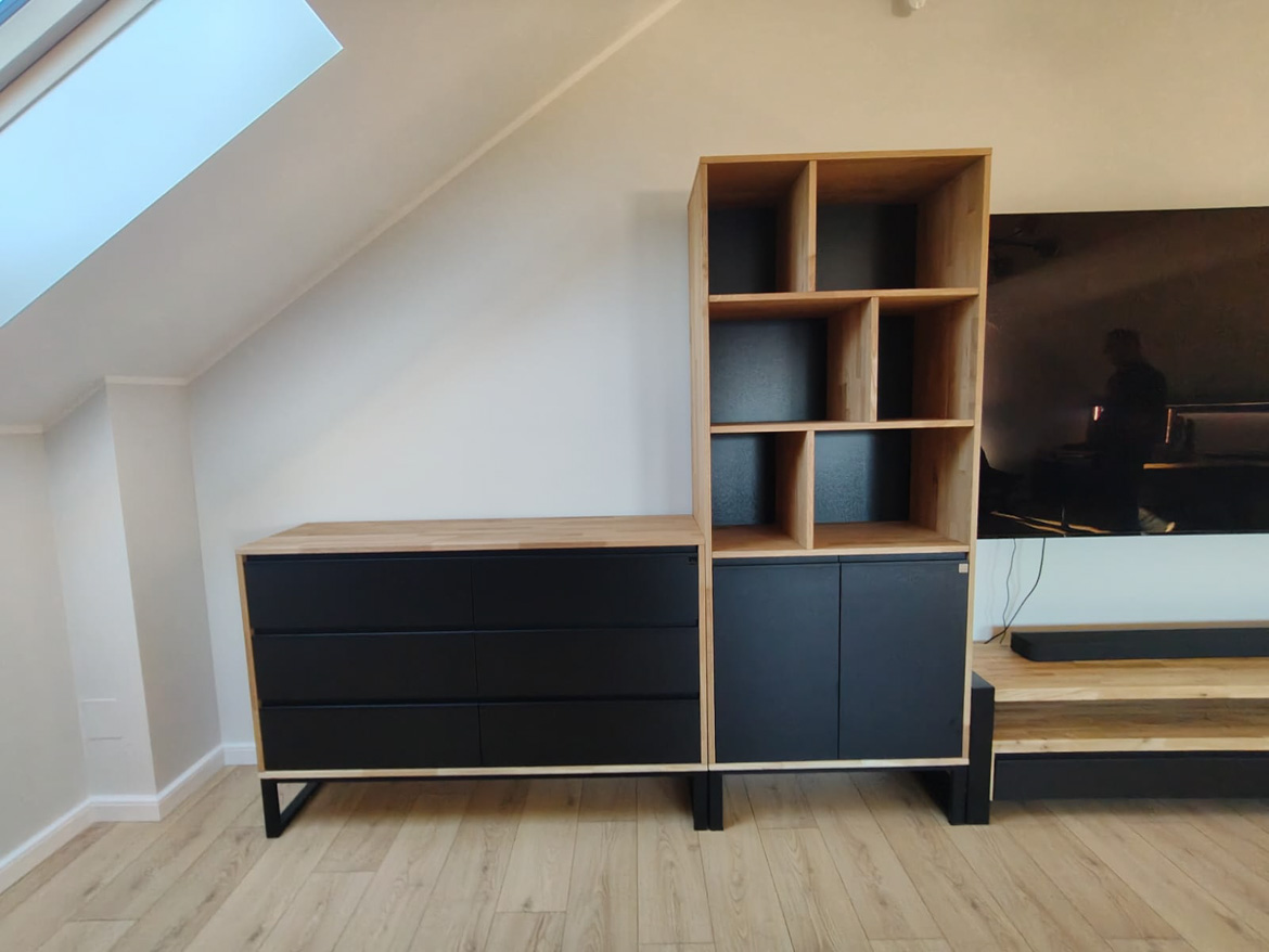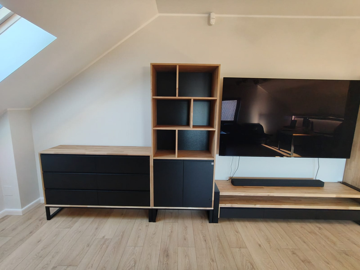 W zestawie znalazła się szafka RTV, regał z otwartymi półkami, komoda oraz wysoka szafa – wszystko dopasowane tak, by dobrze wykorzystać przestrzeń pod skosami.