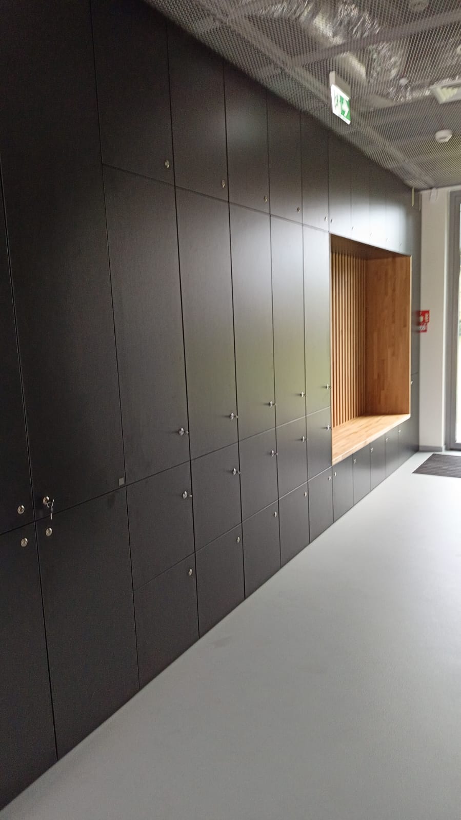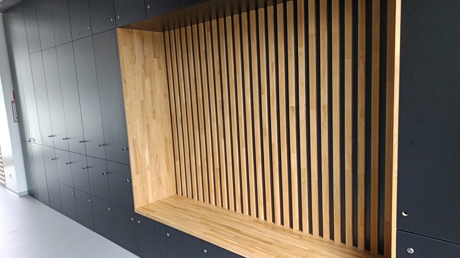Taki układ zabudowy pełni jednocześnie funkcję praktyczną i estetyczną. Wchodząc do muzeum, odwiedzający mogą zostawić swoje rzeczy w zamykanych szafkach, usiąść na chwilę przed rozpoczęciem zwiedzania albo po prostu odetchnąć.