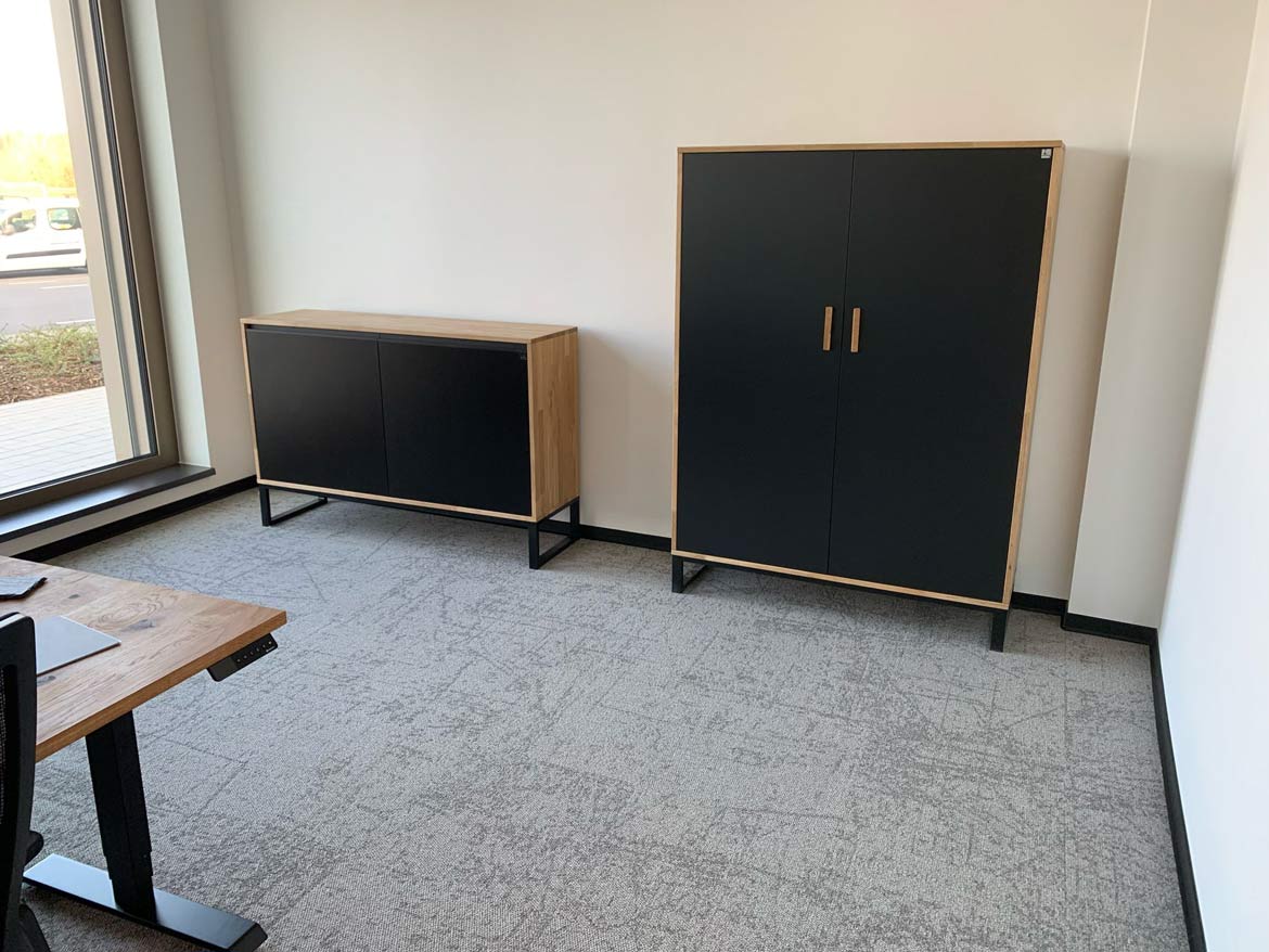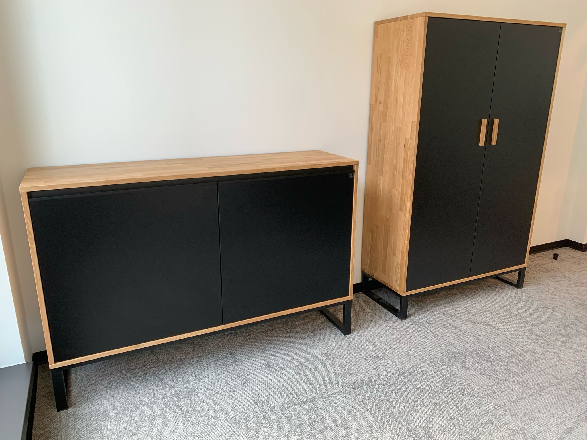 Dla naszego Klienta z Kolonii przygotowaliśmy elegancki zestaw mebli biurowych składający się z komody i szafy aktowej. Meble zostały wykonane z połączenia czarnych frontów i naturalnego dębu, co nadało im ponadczasowy wygląd i solidne wykończenie.